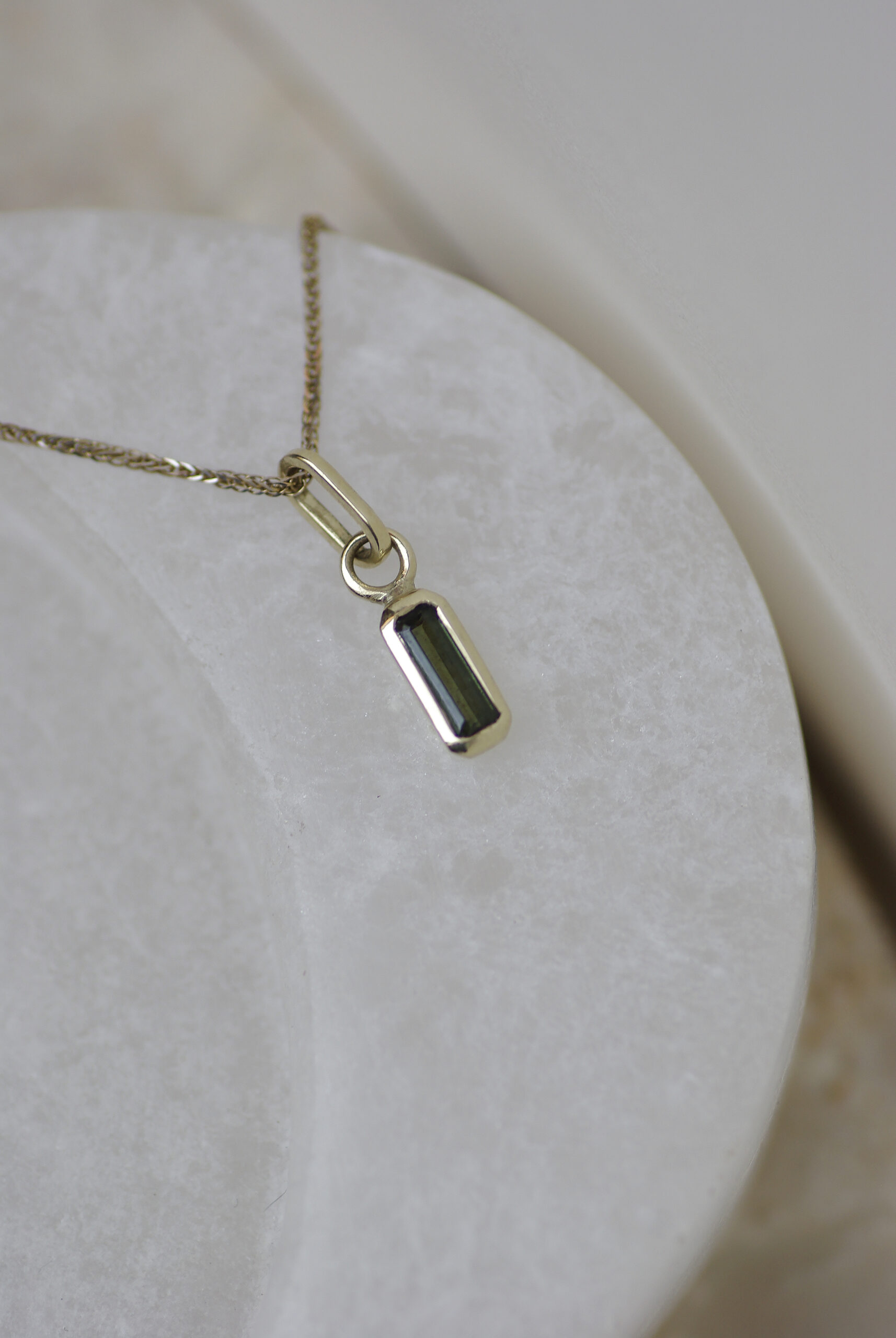 Kifinomult, elegáns nyaklánc természetes mély zöld, egyedi hosszú emerald csiszolású zafír drágaköves medállal.